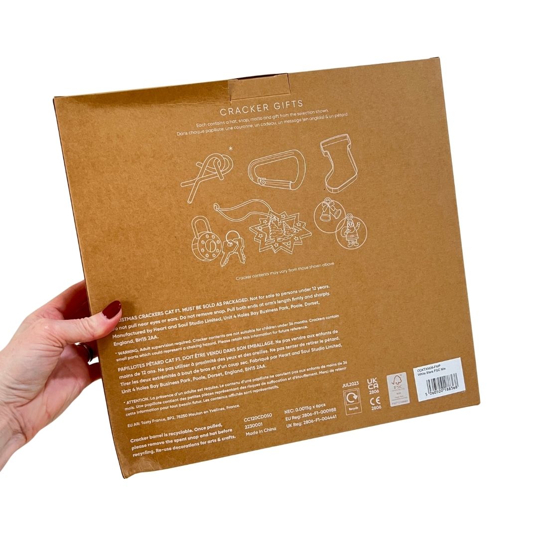 Our Stars & Snow Christmas Crackers, by Dorsets Celebration Crackers, blend rustic charm with elegant design — deep wintery tones paired with classic white jute ribbons and refined kraft accents. Each cracker is filled with a festive hat, a classic joke, a surprise gift, and that unmistakable holiday snap.